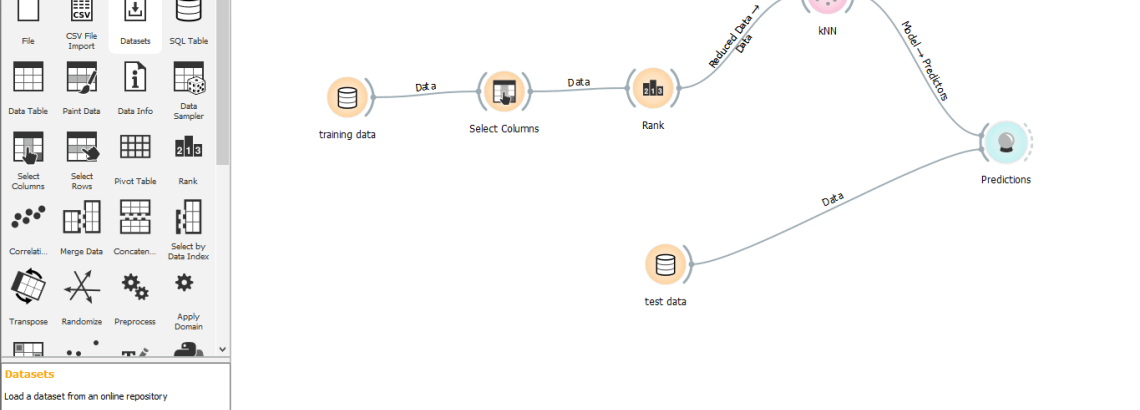 For this article, k-nearest neighbours (KNN) Machine Learning model is used to train the data. Once the data training process is complete, In the next step test data is passed to the Prediction widget to check the accuracy of predictions.