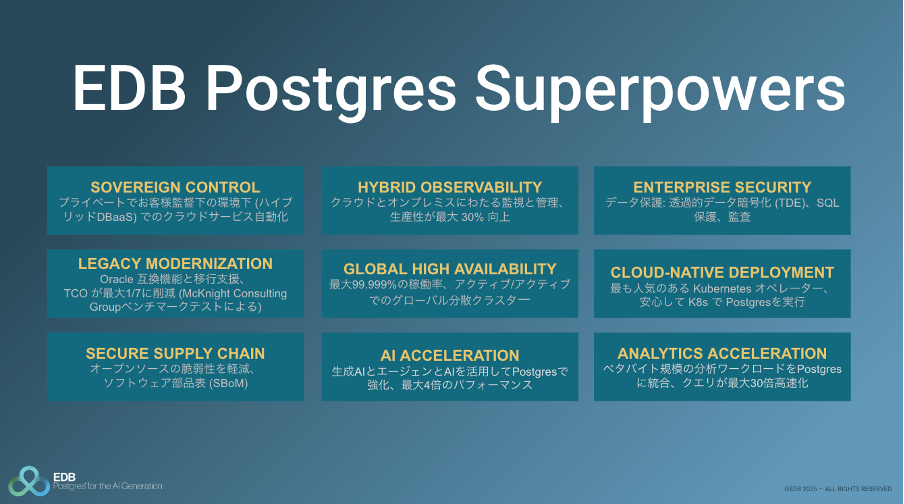 EDBは、Postgresデータおよび AIプラットフォーム事業者として、クラウドからオンプレミスまでの統一されたガバナンスと管理により、トランザクション・分析・AI ワークロードをPostgresに取り込む野心的な製品ロードマップを実現しました。