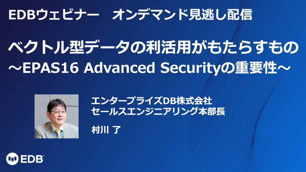 2023年後半から、急速にベクトル型データの利用に注目が集まっています。EDBとしても、EDB Postgres Advanced Server v16(以下EPAS 16)ではpgvectorのサポートをしています。また、ベクトル型データの価値が今後上がってくる際に、データの保護や守り方が課題となります。本ウェビナーではEPAS16におけるデータのセキュリティの確保について説明します。
