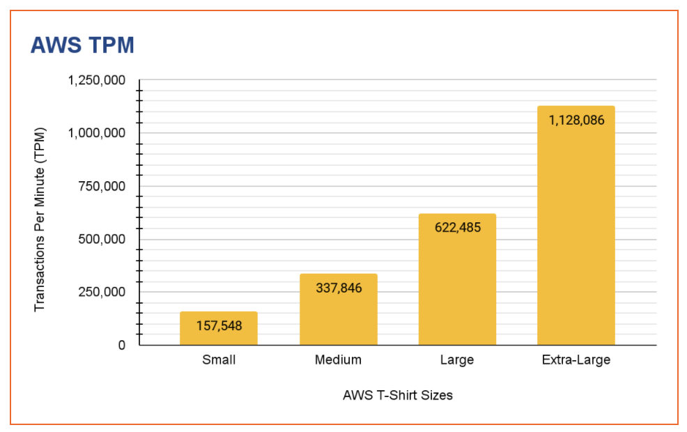 The following graph provides a summary of the Transactions per Minute (TPM) produced utilizing HammerDB with EPAS for each of the T-shirt sizes deployed on AWS.