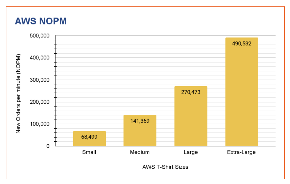 The next graph provides a summary of the New Orders per minute (NOPM) produced utilizing HammerDB with EPAS for each of the T-shirt sizes deployed on AWS.