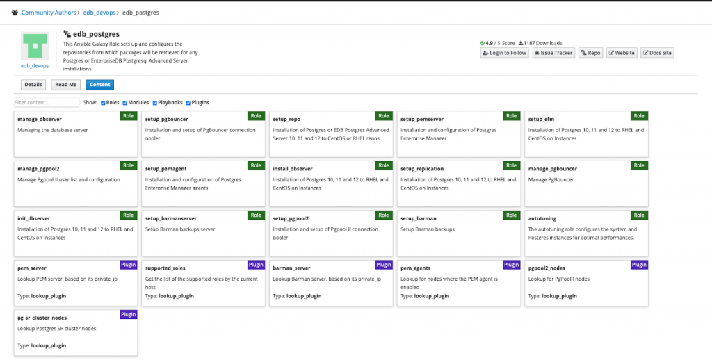 We have chosen Ansible to automate the deployment and configuration of the software. The roles and plugins described in this post are available under the PostgreSQL license at Ansible Galaxy Hub (see below).