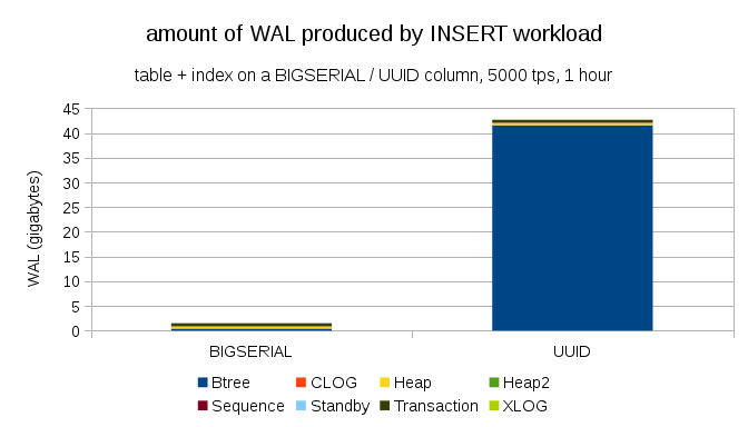 This shows the amount of WAL produced during a 1h benchmark, throttled to 5000 inserts per second. With BIGSERIAL primary key this produces ~2GB of WAL, while with UUID it’s more than 40GB. That’s quite a significant difference, and quite clearly most of the WAL is associated with index backing the primary key. Let’s look as types of WAL records.