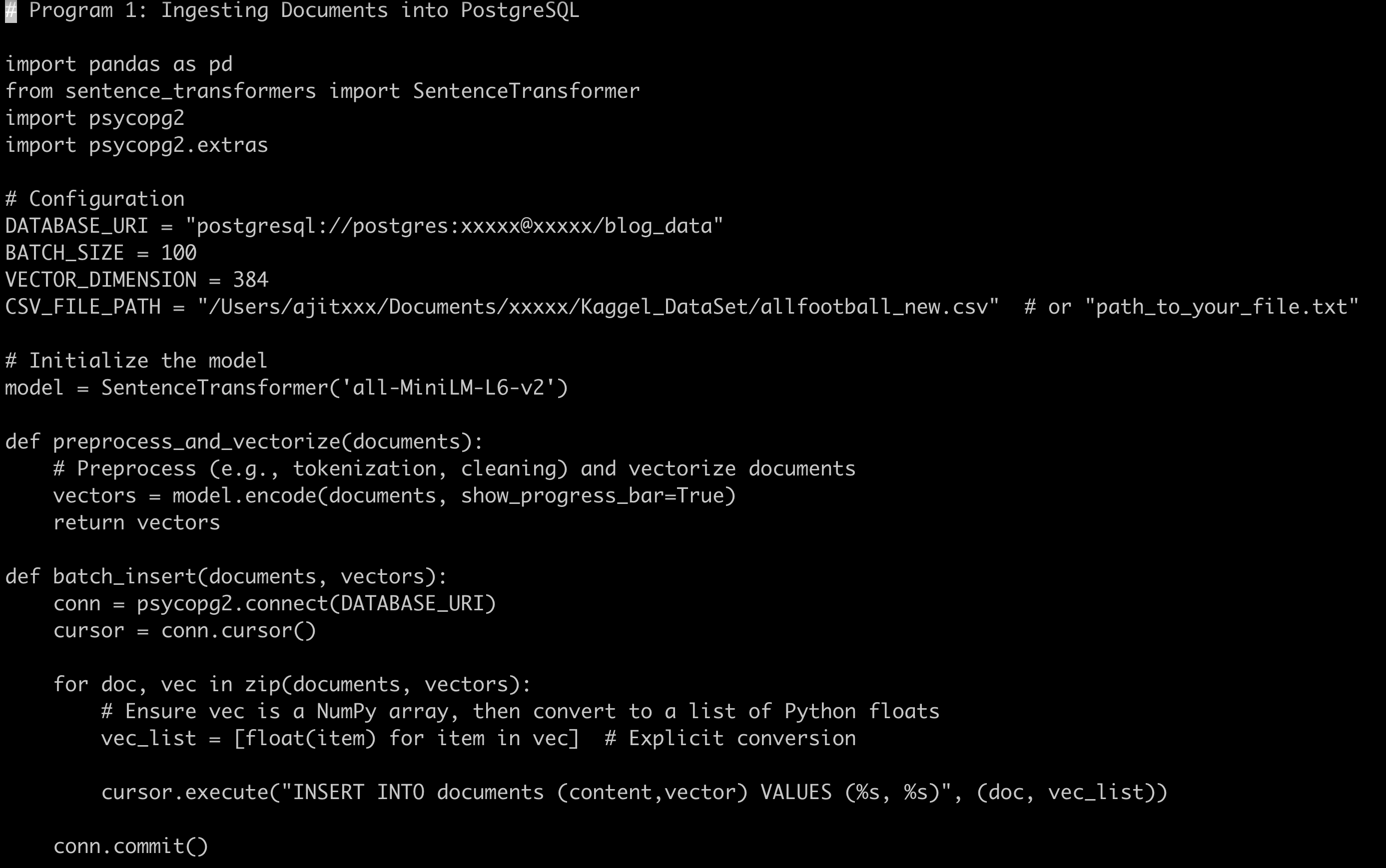 I am ingesting the .csv files in the above Python program, which have football news text data. I want to ingest this text data in batch form to speed up the ingesting process. If you observe, I am using the ‘all-MiniLM-L6-v2’ open-source sentence transformer, a pre-trained model that maps sentences, tokenised and creates vectorisation into 384 dimensions. This gives me 384 dimension vectors ready to ingest into PostgreSQL with pgvector as vector data type.