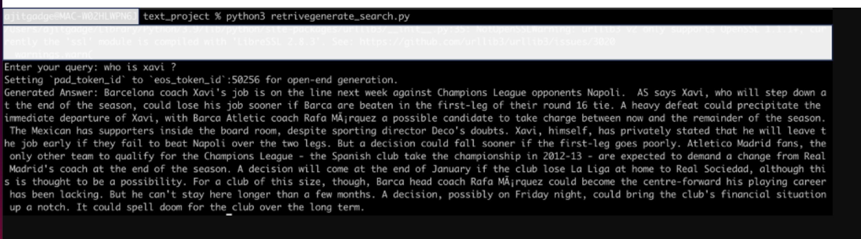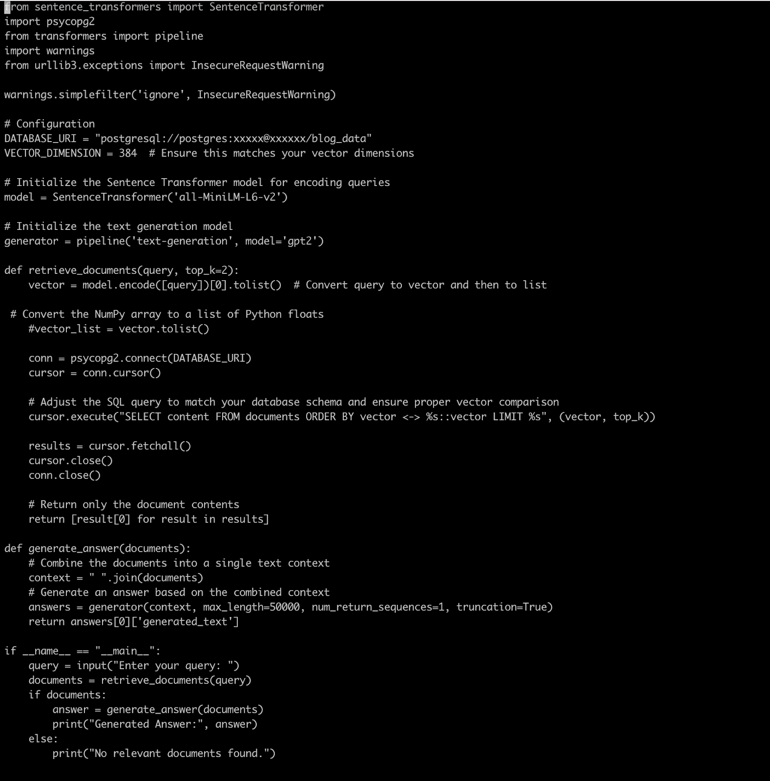 The above program takes the text inputs from the command prompt by asking questions. It will convert the input text into vector form and search these nearby vectors in the pgvector PostgreSQL database. We have captured the top two nearby results here with cosine. Once we got these results, we combined these results and generated answers using the GPT-2 RAG-based model as the answer. Below is a sample output.
