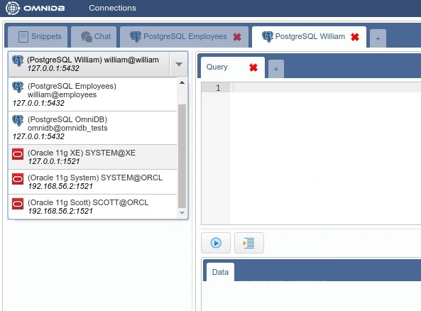 As mentioned above, OmniDB allows you to manage multiple PostgreSQL and Oracle databases within the same unified workspace. The Connection Selector feature allows you to easily switch among the connections we previously configured: