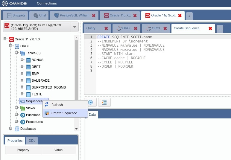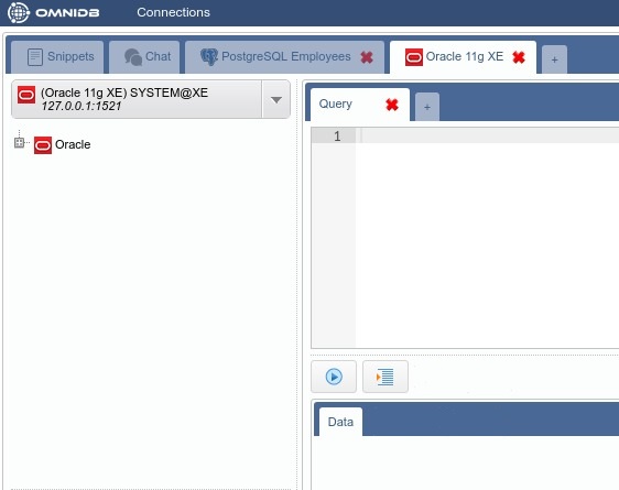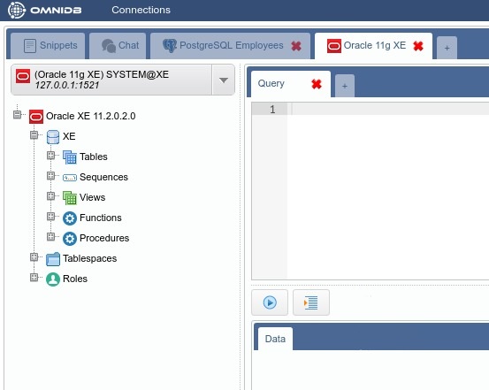 Now that we have selected the connection to Oracle 11g XE, let’s click on the root node of the treeview to expand it. Note how OmniDB detects the exact version of the server and shows a treeview structure very similar to the one you see when managing PostgreSQL databases: