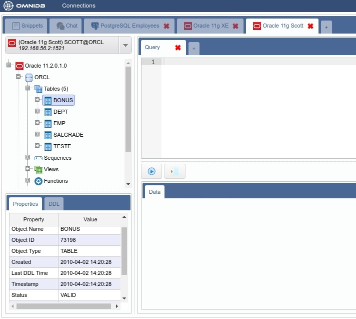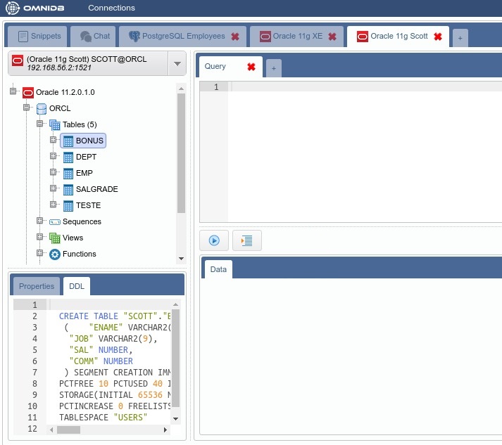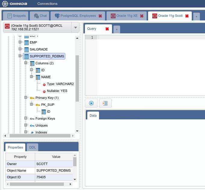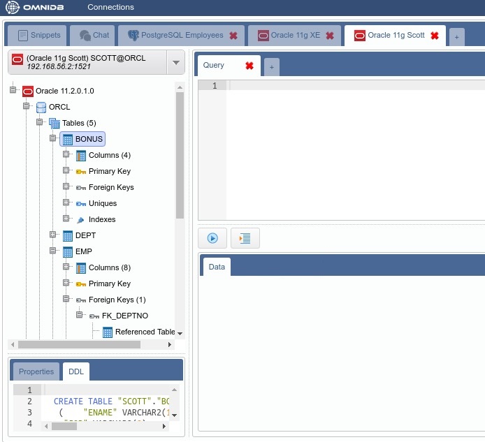 Let’s connect to this Oracle 11g server, using the scott credentials we informed when we created this connection in the Connection Grid. In the following images you can see that scott already owns 5 tables, and by clicking on each of them you can see its properties and DDL SQL (which can be copied). Also, by expanding each table, you can navigate through its elements.