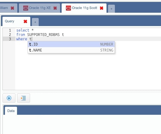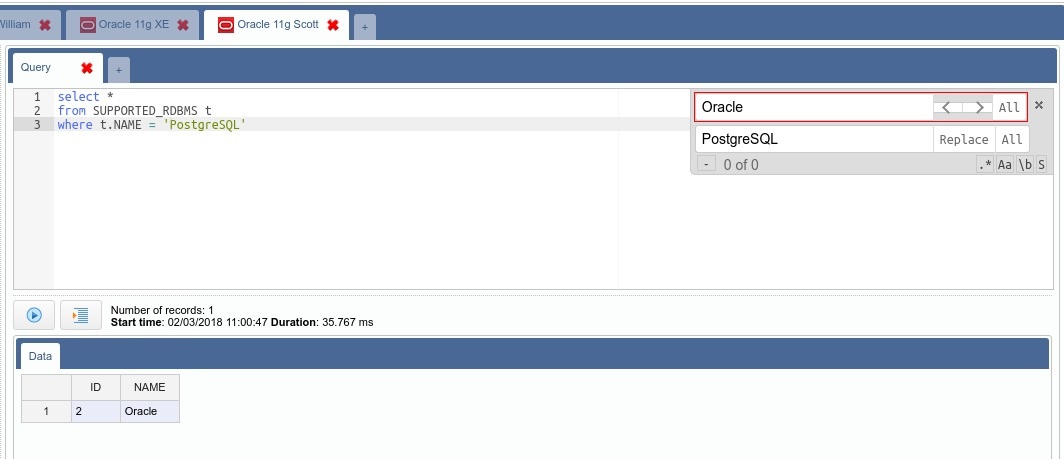 When connected to Oracle databases, in the Query Tab, you can benefit from the same familiar and comfortable SQL editor with SQL syntax highlight, autocomplete for columns of tables and subqueries and Find & Replace feature. The query results will be shown in a grid. You can see all these features in the images below.
