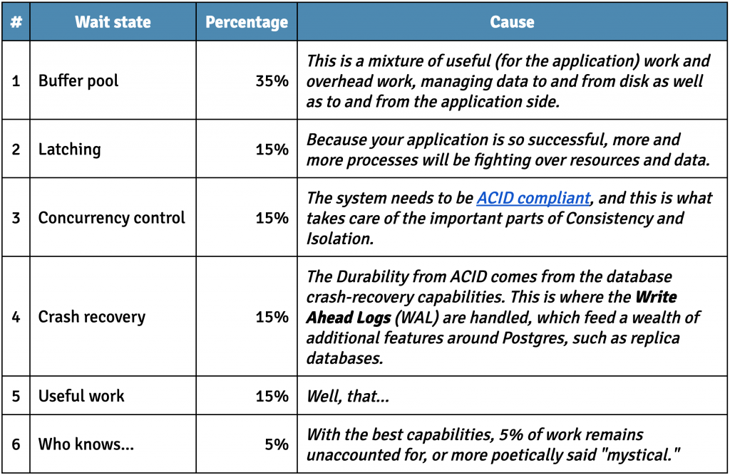 If you want to dive deeper into this, these categories are broken down into wait events in Postgres.