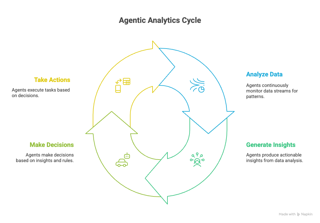 Agentic analytics represents a shift from simply providing data about what happened, to systems that can understand why it happened, what will happen next, what to do about it, and then actually doing it autonomously.