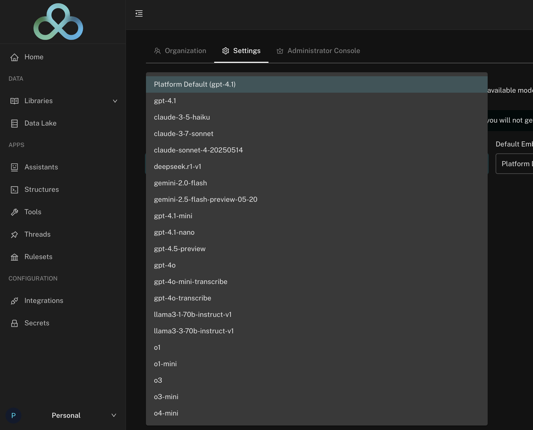 AI Factory allows you to choose from a wide selection of LLMs natively from providers including OpenAI, Google, NVIDIA, and many more, giving you the flexibility to choose the best model to build your agent. This includes chat, embedding, and reranking models with different parameters. The better the LLM you use, the better the response your agent produces.