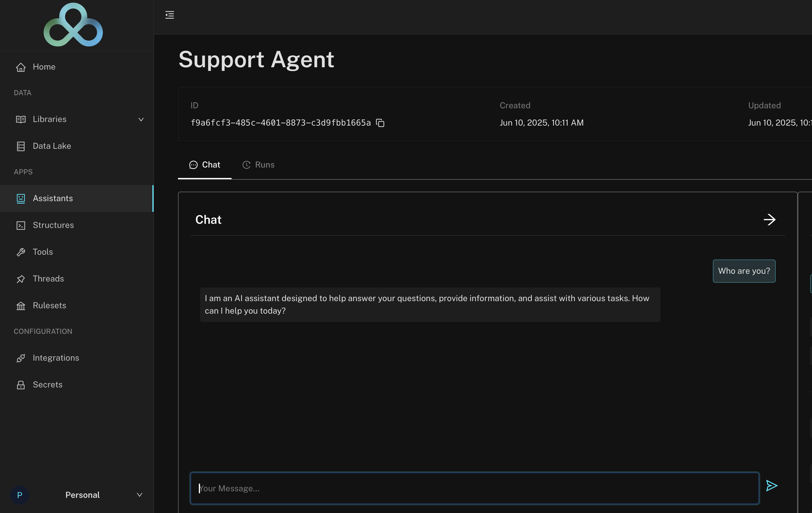 AI Factory offers two approaches to implement an agent. The first option is to use GenAI Builder's low-code environment to create an Assistant — an entity that can converse with humans while utilizing an LLM, knowledge bases, and tools to achieve its goals. With its point-and-click interface, you can build and deploy a fully functioning assistant in just minutes.