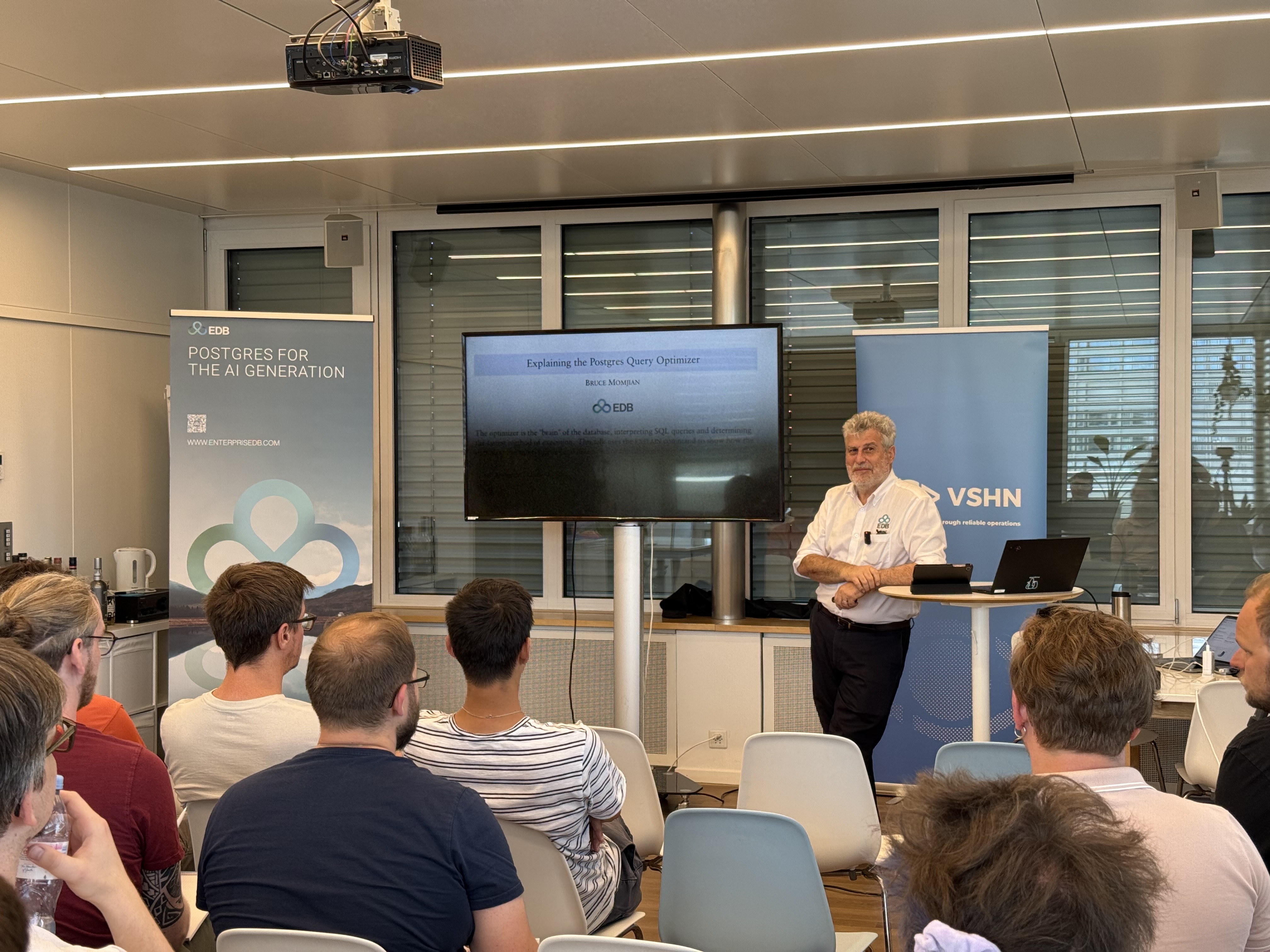 Bruce's next stop was Switzerland. He began with a visit to an EDB customer in Geneva, followed by a talk in Zurich co-hosted by EDB and VSHN, Switzerland’s first Kubernetes-certified provider. The room was packed for his two presentations, Explaining the Postgres Query Optimizer and Beyond Joins and Indexes, underscoring Swiss interest in open source precision.
