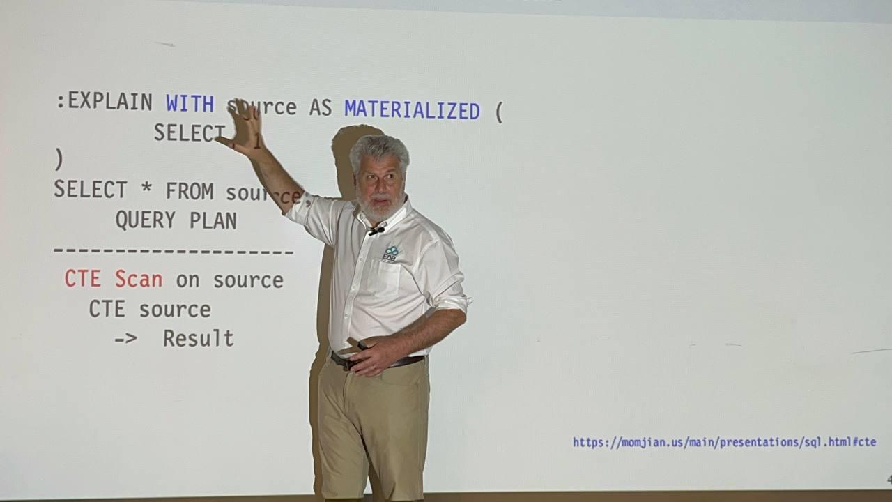 Bruce’s talk, The Optimizer from Start to Finish, covered cost-based query planning, optimizer statistics, joins, and indexes. A recurring audience question—whether the optimizer’s choices are hard-coded—gave Bruce an opportunity to explain how the system uses configuration-defined costs to compute dynamic options for every query.