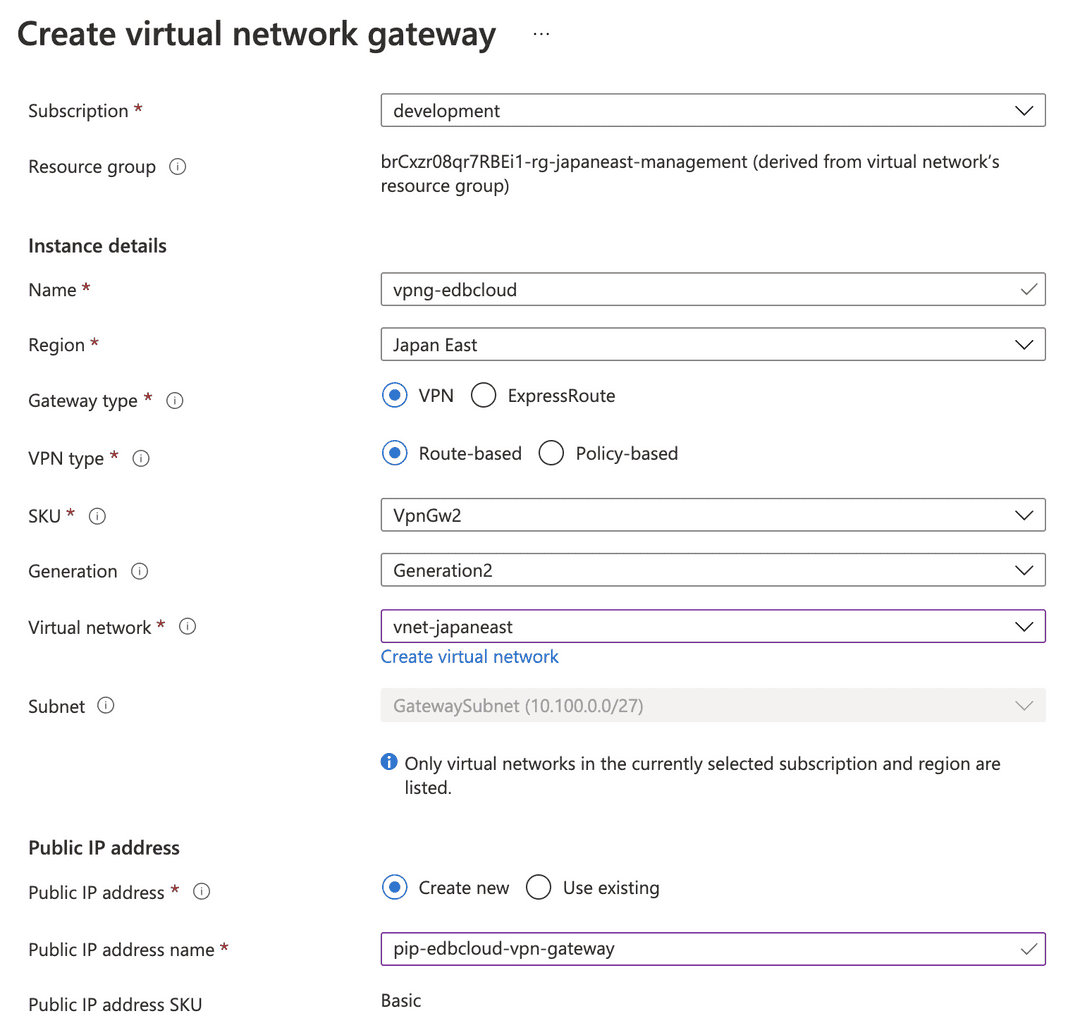 vpng-clienttovpng-edbcloud:az network vpn-connection create \ -n vpnc-client-biganimal \ -g rg-client \ --vnet-gateway1 /subscriptions/.../vpng-client \ -l japaneast \ --shared-key "a_very_long_and_complex_psk!" \ --vnet-gateway2 /subscriptions/.../vpng-biganimal