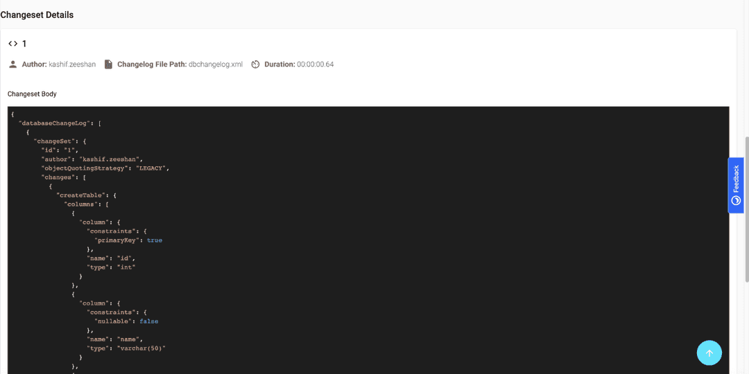 To view the details of the changes made on the target database, select a changelog link. For example, select dbchangelog.xml to see its details.