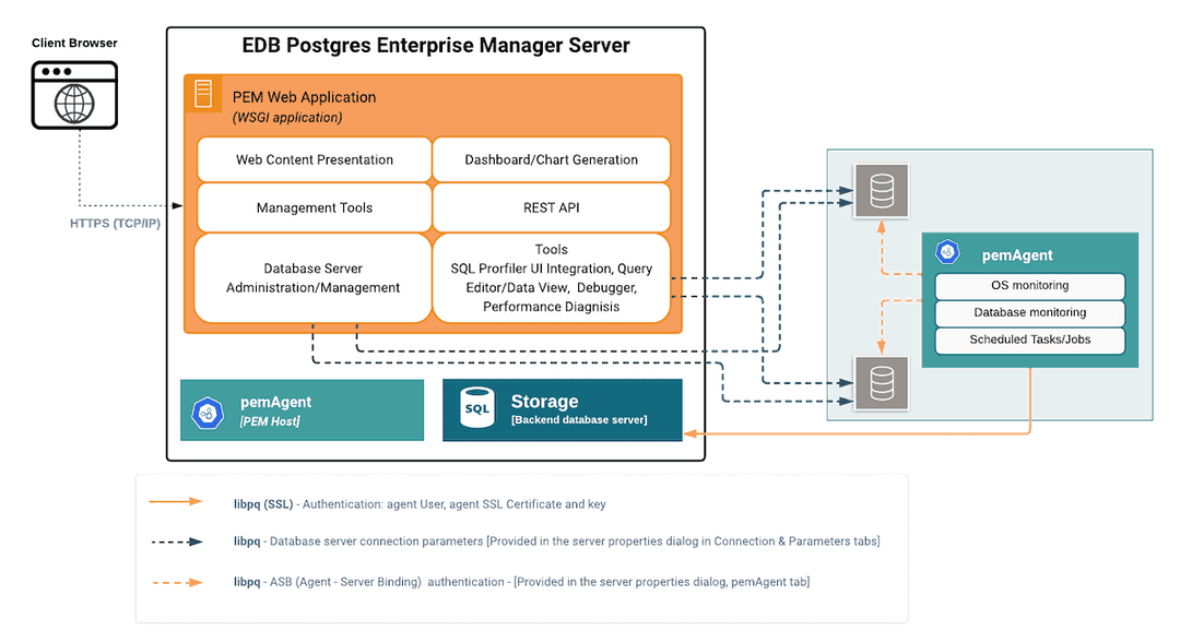 - PEM web client — The PEM web interface allows you to manage and monitor Postgres servers and use PEM extended functionality. The web interface software is installed with the PEM server and is accessed using any supported web browser.