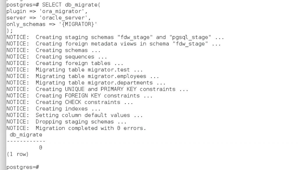 If the migration is successful then the status 0 is returned. After the successful migration, the schema and database objects are created in PostgreSQL.