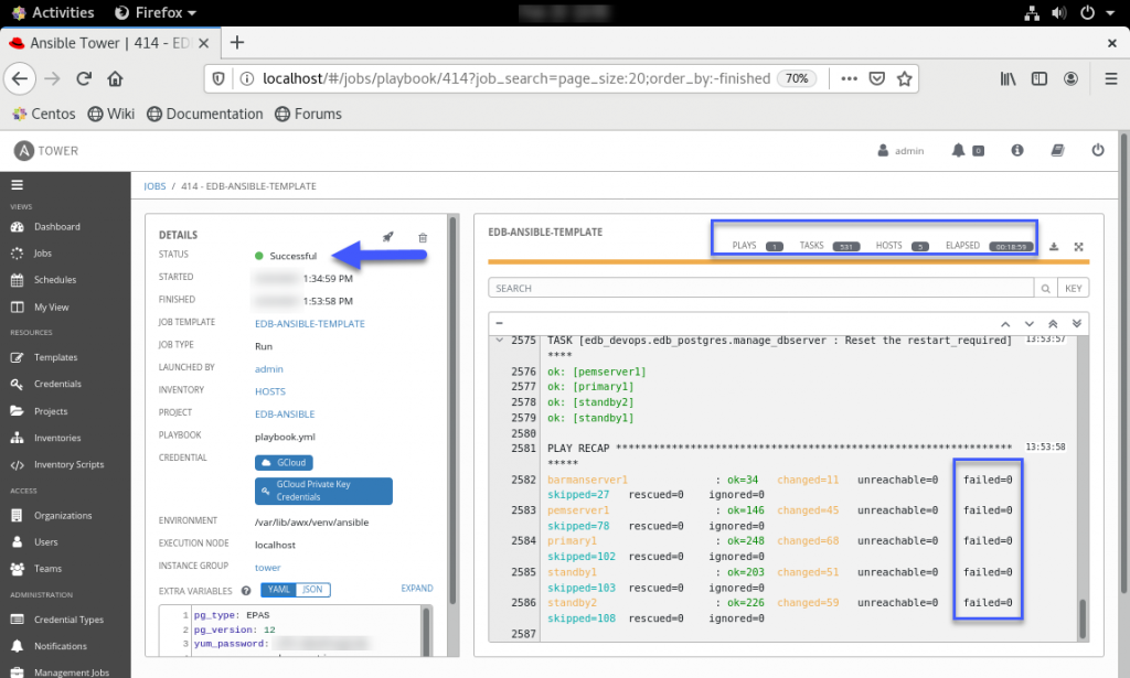 We gained an understanding about how Ansible Tower components relate to each other and, most importantly, their relationships between them. Lastly, we executed a Template that configured EDB PostgreSQL Advanced Server on our Cloud Virtual Machines.
