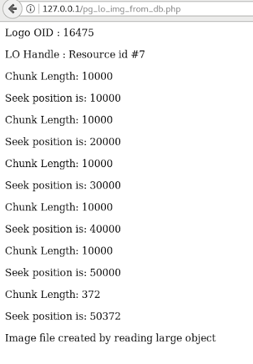 The example PHP program will insert an image, by reading it in chunks, to a PostgreSQL database as a pg_largeobject. The program will then read the inserted image data in chunks and will save it in a new image file.