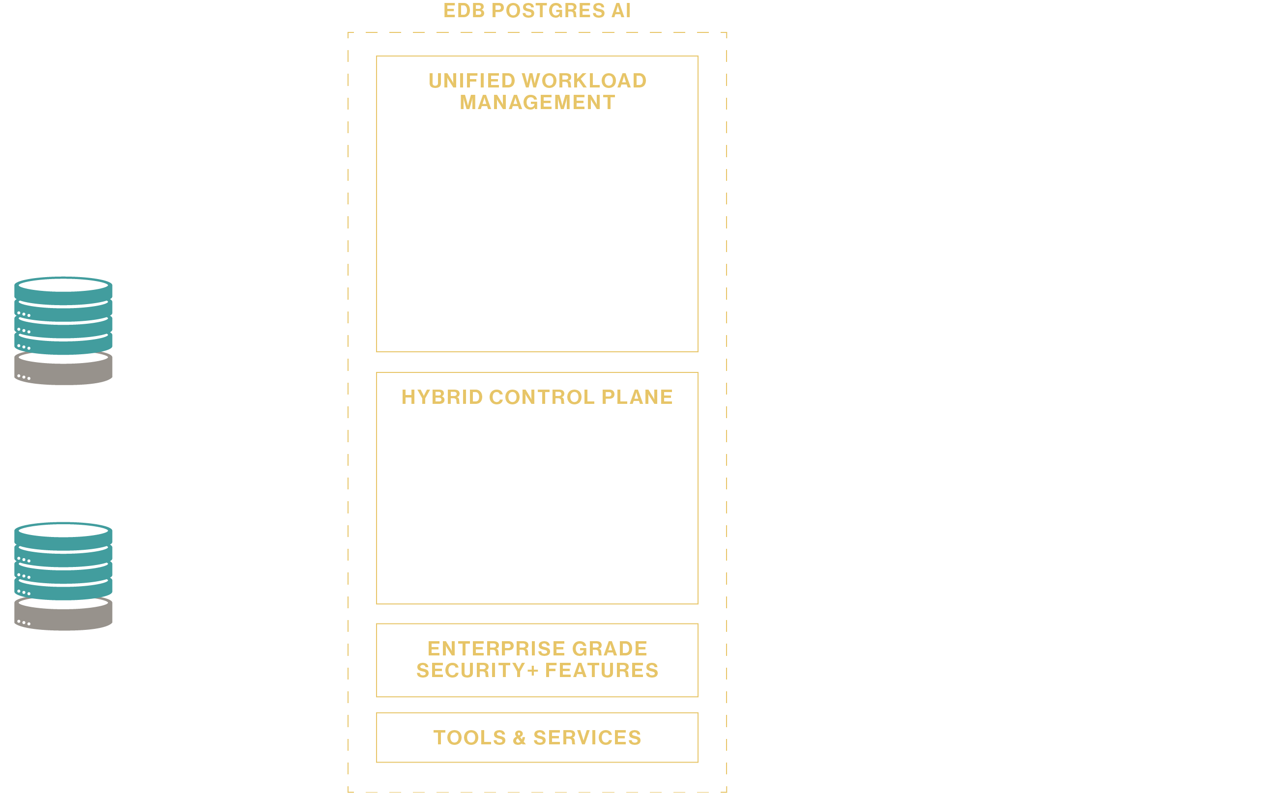 EDB Postgres® AI offers a sovereign data and AI platform with the security and control of bare metal and the agility benefits of cloud, deployed in your environment of choice. Run transactional, analytical, and AI workloads with highly regulated data on-premises to meet compliance standards while running other workloads in the cloud to leverage its flexibility and scalability—all with a consistent experience through a single, unified control plane.